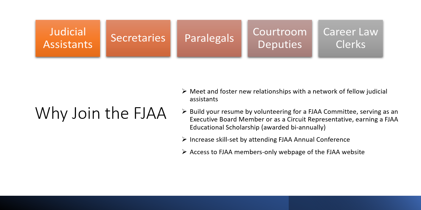 FJAA sponsors an annual conference held in various locations throughout the United States. These conferences are a mixture of business, learning, fun and fellowship. FJAA was established as an association dedicated to a very special group--federal judges' assistants. Your input is vital to its success in accomplishing goals with your interests at heart.